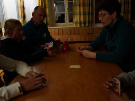So trafen am Freitag nach und nach die Teilnehmer ein – zwei Teilnehmer kamen mit dem Fahrrad und waren ziemlich nass geworden. Die Freude war groß, sich wieder zu sehen. Wir hatten keinerlei Anlaufschwierigkeiten und knüpften direkt an das letzte Wochenende an: man kennt sich, auch die „neuen“ Teilnehmer waren sogleich in die Gemeinschaft eingebunden, und so begannen wir das Wochenende mit einem „Mitbringbüffet“, das keine Wünsche offen ließ. Wir nutzten die Zeit am ersten Abend, uns wieder gegenseitig auf den aktuellen Stand zu bringen, und die Kinder und Jugendlichen hatten Freude am gemeinsamen Spiel.